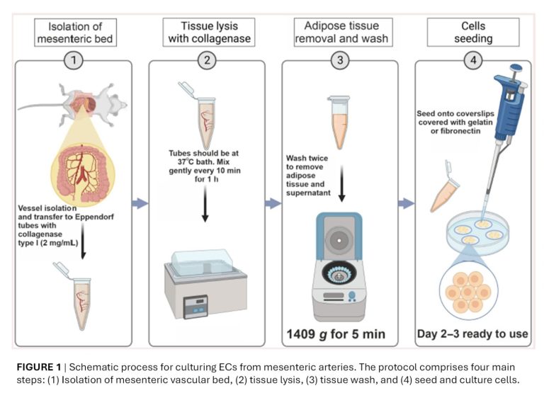 Schematic process for culturing ECs from mesenteric arteries. The protocol comprises four main steps: (1) Isolation of mesenteric vascular bed, (2) tissue lysis, (3) tissue wash, and (4) seed and culture cells. The protocol and functional standardization using different matrix was publish in Microcirculation Journal. Burboa P.C. et al. Microcirculation 2024 Jul;31(5):e12859. PMID: 38818977